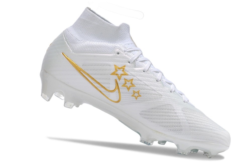 This is custom nike mercurial superfly soccer cleats for Enzo Fernandez,feature a colorway of white/blue/gold, feature a base white upper combine with a Swoosh logo which outlined in Gold color and three gold stars.The heel features a fading blue diamond geometric pattern, with the lighter blue combining with the white base to nod to the Argentina national colours, and the darker blue linking to Chelsea. the heel additions, with “AFA” on the left and “E8” on the right.Improve your speed at your next soccer match with the Nike Zoom Mercurial Superfly 9 Enzo Fernandez Elite FG soccer cleats.